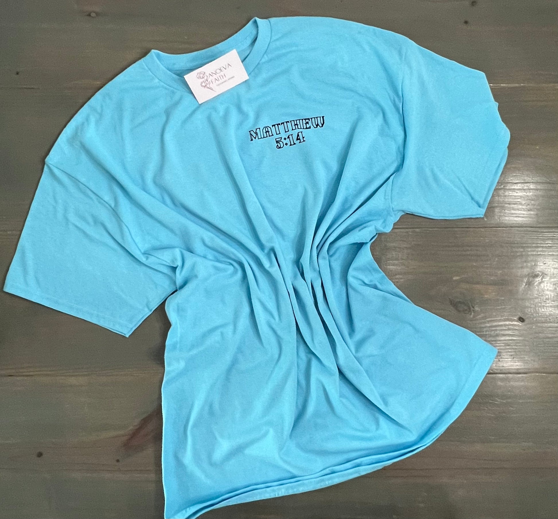 Crafted with 100% cotton, this unique shirt features an original design showcasing the powerful message of Matthew 5:14. Own a piece of inspirational apparel that is both comfortable and impactful. Unleash your light onto the world.